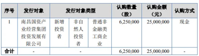 日前,南昌國資產(chǎn)業(yè)經(jīng)營集團(tuán)投資發(fā)展有限公司(簡稱“南昌產(chǎn)投”)以現(xiàn)金方式認(rèn)購625.0萬股,每股價(jià)格為4元,認(rèn)購金額2500萬元。
