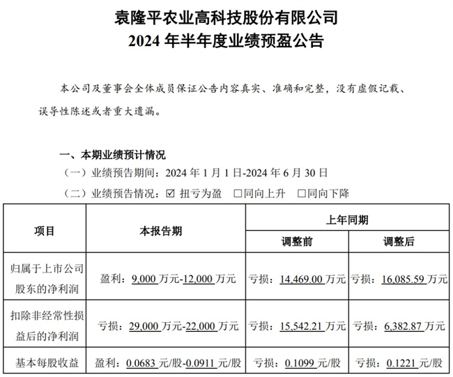 7月8日,隆平高科公布2024年半年度業(yè)績預盈公告。預計2024年上半年凈利潤9000萬元-1.2億元,同比扭虧為盈。根據(jù)公告,上年同期調整后虧損6382.87萬元。
