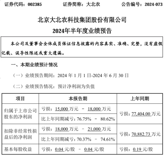 大北農:預計2024上半年凈利潤虧損1.5億元-1.8億元,同比減虧