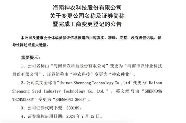 神農(nóng)科技公告,近日,公司已完成工商變更登記備案手續(xù),并取得了由海南省市場監(jiān)督管理局換發(fā)的《營業(yè)執(zhí)照》。公司名稱由“海南神農(nóng)科技股份有限公司”變更為“海南神農(nóng)種業(yè)科技股份有限公司”,證券簡稱由“神農(nóng)科技”變更為“神農(nóng)種業(yè)”。證券簡稱啟用日期為2024年7月12日,公司證券代碼不變:300189。