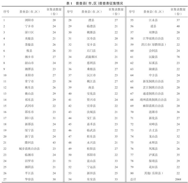 8年來,在農(nóng)業(yè)農(nóng)村部的總體部署下,在湖南省委省政府的高度重視、大力支持與精心組織下,在第三次全國農(nóng)作物種質(zhì)資源普查與收集行動項目辦公室的指導(dǎo)下,經(jīng)過湖南省農(nóng)業(yè)農(nóng)村廳、湖南省農(nóng)業(yè)科學(xué)院、14個市(州)和普查縣(市、區(qū))農(nóng)業(yè)農(nóng)村系統(tǒng)和科研院所等所有普查(調(diào)查)人員共同努力下,克服重重困難,完成了此次資源調(diào)查行動。參加本行動的本地區(qū)省、地、縣、鄉(xiāng)行政人員和農(nóng)科院、高校、種子站等專業(yè)技術(shù)人員1280人,走訪鄉(xiāng)鎮(zhèn)834個,走訪行政村1484個,走訪人數(shù)7608人,總行程154500km,組織培訓(xùn)3250人,采集數(shù)據(jù)211244條,宣傳報道134次,印發(fā)相關(guān)宣傳材料、條幅等7192份。完成了80個普查縣(市、區(qū))(其中包括79個項目縣和1個補充縣)的資源普查與征集任務(wù),每個縣資源超過20份,共征集各類資源2068份(表1),基本摸清了轄區(qū)種質(zhì)資源家底。在普查基礎(chǔ)上,選擇了24個有區(qū)域代表性、種質(zhì)資源豐富的項目縣進行各類作物種質(zhì)資源的系統(tǒng)調(diào)查,搶救性收集栽培作物的古老地方品種、種植年代久遠的育成品種、重要作物的野生近緣植物以及其他珍稀、瀕危野生植物種質(zhì)資源3024份(其中項目外縣141份)(表2)。對征集和系統(tǒng)調(diào)查到的種質(zhì)資源,進行繁殖和基本生物學(xué)特征特性的鑒定評價,完成3819份新種質(zhì)資源繁殖、編目性狀的鑒定評價。經(jīng)過整理、整合并結(jié)合農(nóng)民認(rèn)知進行編目,并將全部資源5092份上交至國家農(nóng)作物種質(zhì)資源庫(即國家作物種質(zhì)庫)等18個國家農(nóng)作物種質(zhì)資源庫(圃)(表3)。