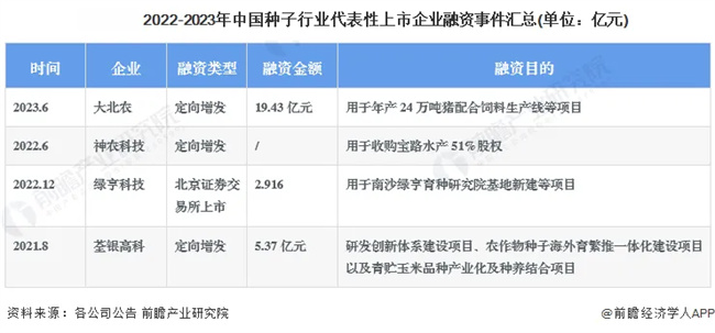根據(jù)代表性上市企業(yè)融資公告,種子行業(yè)的上市公司融資手段主要有定向增發(fā)。整體來看,中國種子行業(yè)上市企業(yè)的融資主要用于建設(shè)新項(xiàng)目。2022-2023年種子行業(yè)代表性企業(yè)主要的融資事件如下: