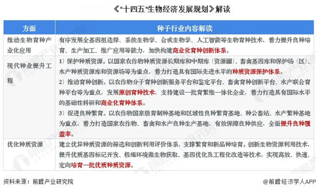 國家高度重視現(xiàn)代農(nóng)作物種業(yè)發(fā)展,從“十二五”規(guī)劃到“十四五”規(guī)劃,我國均堅(jiān)持大力發(fā)展種業(yè)發(fā)展,推進(jìn)生物育創(chuàng)新和產(chǎn)業(yè)化應(yīng)用,建設(shè)育種基地,推動(dòng)種業(yè)企業(yè)提升國際競爭力。根據(jù)國家發(fā)改委《“十四五”生物經(jīng)濟(jì)發(fā)展規(guī)劃》,提出發(fā)展現(xiàn)代種業(yè)等7項(xiàng)建設(shè)工程,推動(dòng)生物育種,完善種質(zhì)資源保護(hù)體系建設(shè),加快構(gòu)建商業(yè)化育種創(chuàng)新體系。政策主要內(nèi)容如下: