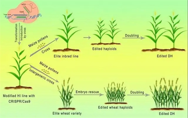 先正達(dá)公司開發(fā)出類似的單倍體誘導(dǎo)編輯(haploid induction HI-Edit)技術(shù),可對栽培品種進(jìn)行直接改良。他們運(yùn)用HI-Edit技術(shù)創(chuàng)建了帶有特異性狀標(biāo)記的ZmMATL敲除的單倍體株系,該單倍體株系與不同優(yōu)良自交系產(chǎn)生的雜交后代的田間產(chǎn)量顯著增加。此外,HI-Edit技術(shù)和CENH3系統(tǒng)結(jié)合可以用于雙子葉植物的改良。更讓人興奮的是,將攜帶有Cas9-TaGT1s 的轉(zhuǎn)基因玉米的花粉與小麥品種進(jìn)行遠(yuǎn)源雜交,成功獲得經(jīng)基因編輯改良的小麥單倍體植株。這些研究表明,HI-Edit技術(shù)突破現(xiàn)有基因編輯體系受物種和基因型的限制,能在商業(yè)化的優(yōu)勢品種中應(yīng)用,而且HI-Edit系統(tǒng)與屬間雜交技術(shù)巧妙結(jié)合,有望實(shí)現(xiàn)遠(yuǎn)緣雜交改良目標(biāo)作物,具有廣闊的應(yīng)用前景。