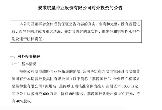 公告顯示,根據(jù)公司發(fā)展戰(zhàn)略與業(yè)務拓展的需要,皖墾種業(yè)決定在六安市霍邱縣與安徽蓼源國有資本運營控股集團有限公司(以下簡稱“蓼源國控”)合資設(shè)立霍邱縣蓼墾種業(yè)有限公司(擬用名,最終以工商核準名稱為準)。