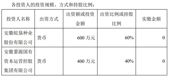 根據(jù)公告,霍邱縣蓼墾種業(yè)有限公司注冊資本 1000 萬元。其中,皖墾種業(yè)認繳出資 600 萬元,持有 60%股權(quán);蓼源國控認繳出資 400 萬元,持有 40%股權(quán)。