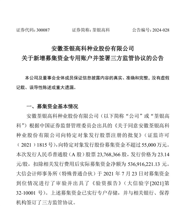 安徽荃銀高科種業(yè)股份有限公司(以下簡稱“公司”或“荃銀高科”)根據(jù)中國證券監(jiān)督管理委員會出具的《關(guān)于同意安徽荃銀高科種業(yè)股份有限公司向特定對象發(fā)行股票注冊的批復(fù)》(證監(jiān)許可﹝2021﹞1815號),向特定對象發(fā)行股份募集資金不超過55,000萬元。本次發(fā)行人民幣普通股(A股)股票23,768,366股,發(fā)行價(jià)格為23.14元/股,扣除相關(guān)發(fā)行費(fèi)用后實(shí)際募集資金凈額為536,916,221.13元。大信會計(jì)師事務(wù)所(特殊普通合伙)于2021年7月23日對募集資金到位情況進(jìn)行了審驗(yàn)并出具了《驗(yàn)資報(bào)告》(大信驗(yàn)字[2021]第32-10001號)。上述募集資金已實(shí)行專戶存儲,并與相關(guān)銀行、保薦機(jī)構(gòu)簽訂了三方監(jiān)管協(xié)議。