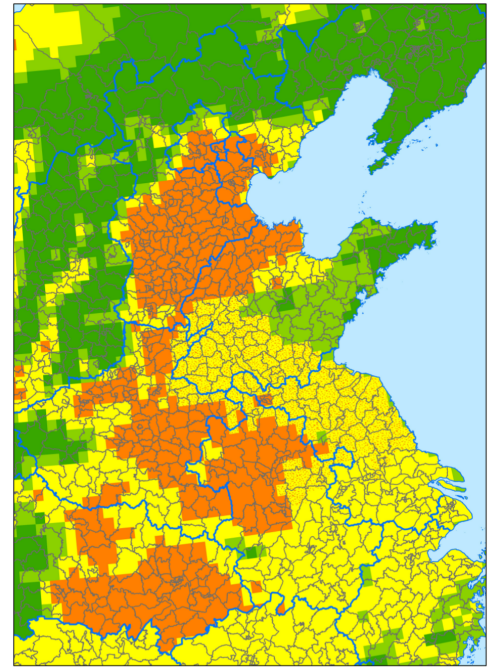 受近期第3號(hào)臺(tái)風(fēng)“格美”北上影響,玉米南方銹病菌源可能傳播擴(kuò)散到黃淮海地區(qū),且臺(tái)風(fēng)帶來的豐沛雨水和較大幅度降溫,將創(chuàng)造適溫、高濕的氣象條件,十分有利于南方銹病孢子的沉降、侵染和病害的暴發(fā)流行。根據(jù)專家會(huì)商,綜合分析菌源、品種、臺(tái)風(fēng)北上、天氣和耕作制度等影響因素,預(yù)計(jì)今年玉米南方銹病在黃淮海玉米主產(chǎn)區(qū)偏重至大發(fā)生,對(duì)玉米生產(chǎn)安全構(gòu)成較大威脅,全國(guó)發(fā)生面積8000萬畝,發(fā)生流行盛期為8月中旬至9月下旬。根據(jù)模型預(yù)測(cè),未來2—3周,河南大部,江西、湖南和湖北局部,浙江、安徽和江蘇北部,山東西部,河北、北京、天津玉米南方銹病暴發(fā)流行風(fēng)險(xiǎn)較高(見圖1)。