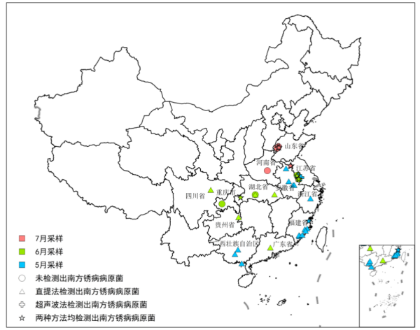 前期,我國(guó)福建等南方玉米產(chǎn)區(qū)南方銹病已普遍發(fā)生,5月底至7月中旬檢測(cè)來自福建漳州、福州、廈門、泉州、莆田等市的9個(gè)縣(區(qū))共184份疑似樣品,均鑒定為玉米南方銹病,檢出率100%。同時(shí),5月18日—7月20日開展更大范圍的玉米葉片采樣和分子檢測(cè),結(jié)果顯示,南方、長(zhǎng)江中下游、黃淮海地區(qū)53份玉米葉片中37份含有南方銹病病菌,占比達(dá)69.8%,存在大范圍流行的菌源條件(見圖2)。截至7月24日,河南省南陽市鎮(zhèn)平縣、周口市淮陽區(qū)、長(zhǎng)葛市、許昌市魏都區(qū)、尉氏縣等地疑似病葉,經(jīng)病原PCR檢測(cè)確認(rèn)為南方銹病,目前為初期單個(gè)病斑,發(fā)生時(shí)間早于去年同期、見病點(diǎn)數(shù)多于去年同期。
