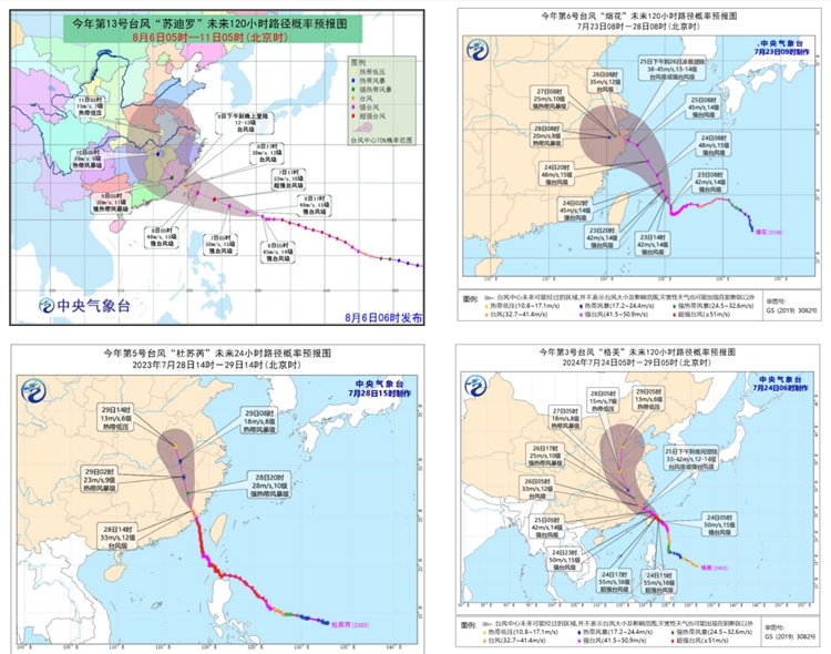 圖3 2024年臺(tái)風(fēng)“格美”與2015年臺(tái)風(fēng)“蘇迪羅”、2021年臺(tái)“煙花”、2023年臺(tái)風(fēng)“杜蘇芮”路徑對(duì)比