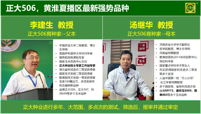 紀(jì)總表示,正大506師出名門:父本出自國(guó)家玉米改良中心原主任、中國(guó)農(nóng)業(yè)大學(xué)知名教授李建生老師,母本出自河南農(nóng)業(yè)大學(xué)副校長(zhǎng)、教授、博士生導(dǎo)師湯繼華老師,二者強(qiáng)強(qiáng)聯(lián)合,正大種業(yè)進(jìn)行多年、大范圍、多點(diǎn)次的測(cè)試、篩選后,報(bào)審并通過(guò)審定。