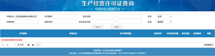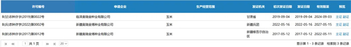在中國種業(yè)大數(shù)據(jù)平臺上,目前已查詢不到北京奧瑞金種業(yè)的生產(chǎn)經(jīng)營許可證信息。關聯(lián)企業(yè)臨澤奧瑞金種業(yè)有限公司、新疆奧瑞金博種業(yè)有限公司的生產(chǎn)經(jīng)營許可證,則仍在有效期內(nèi)。