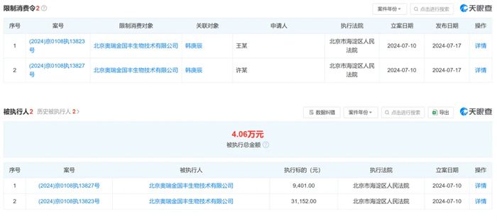 另據(jù)公開信息,奧瑞金種業(yè)第二大股東、持股占比約46.85%的北京奧瑞金國豐生物技術有限公司,已被列為“被執(zhí)行人”“限制高消費”。