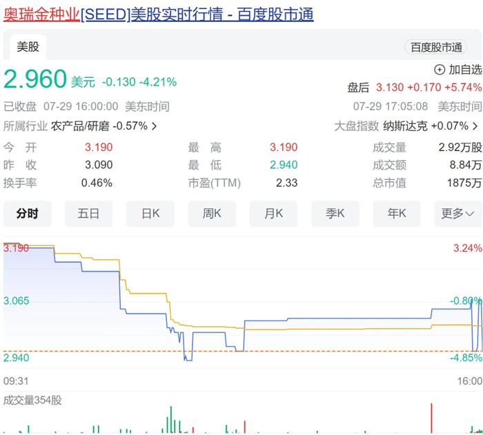 在7月12日(美國東部時間)收盤,奧瑞金種業(yè)報收于3.5美元/股,下跌12.06%,成交量6.87萬股。截至7月29日(美國東部時間)收盤,報收于2.96美元/股,下跌4.21%,市值僅剩1875萬美元。