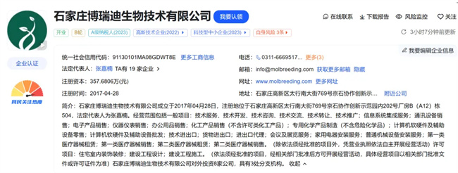 公開信息顯示,博瑞迪成立于2017年,注冊資本約358萬元,屬于科技型中小企業(yè)、高新技術企業(yè),是一家專業(yè)從事生物育種技術研發(fā)與服務的企業(yè)。