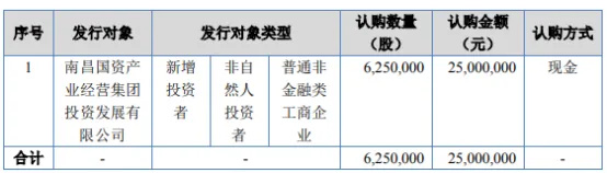 較早前,南昌國資產(chǎn)業(yè)經(jīng)營集團投資發(fā)展有限公司(簡稱“南昌產(chǎn)投”)以現(xiàn)金方式認購625.0萬股,每股價格為4元,認購金額2500萬元。