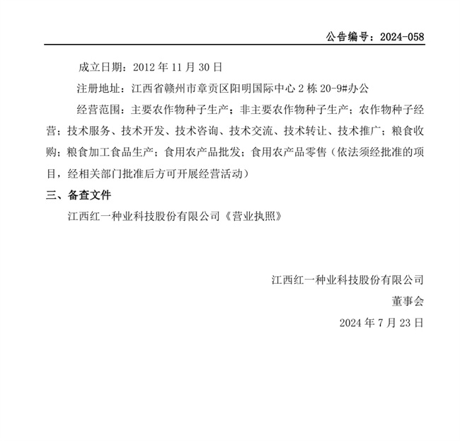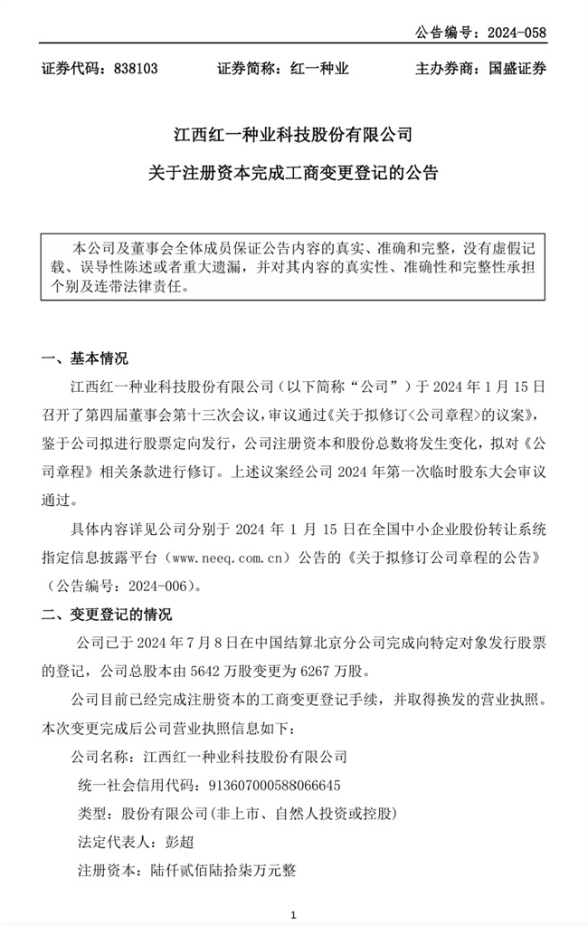 近日,江西紅一種業(yè)科技股份有限公司公告稱,鑒于公司進行股票定向發(fā)行,公司注冊資本、股份總數(shù)發(fā)生變化,公司已完成向特定對象發(fā)行股票的登記,公司總股本由5642萬股變更為6267萬股。