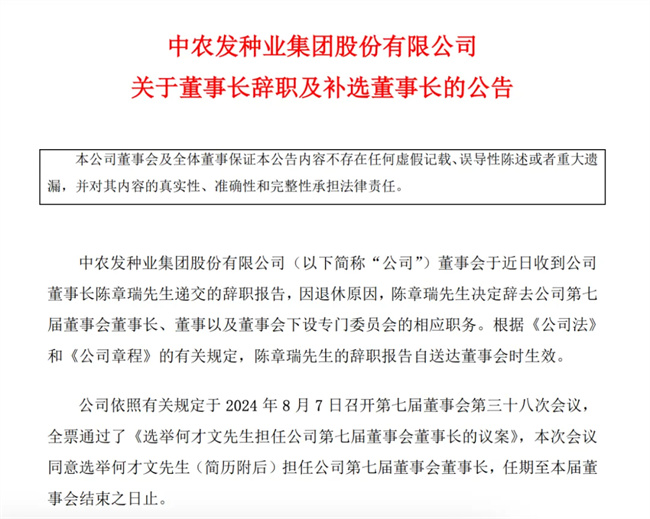 8月7日,中農(nóng)發(fā)種業(yè)集團股份有限公司(以下簡稱“農(nóng)發(fā)種業(yè)”)公告,因退休原因,陳章瑞決定辭去公司第七屆董事會董事長、董事等相應職務。公司董事會同意選舉何才文擔任公司第七屆董事會董事長。