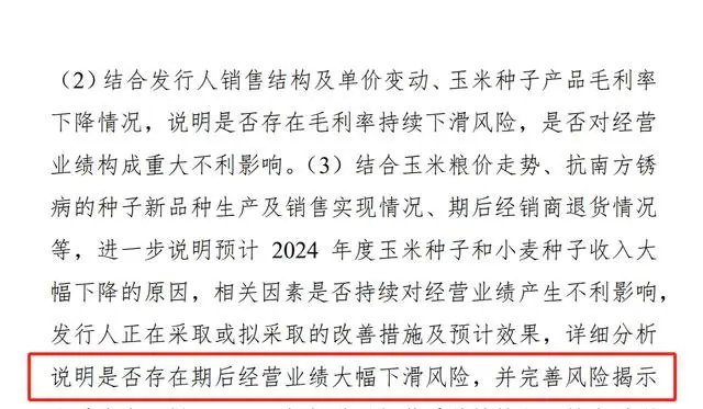 此外,交易所要求公司結合銷售結構及單價變動、玉米種子產(chǎn)品毛利率下降情況,說明是否存在毛利率持續(xù)下滑風險,是否對經(jīng)營業(yè)績構成重大不利影響;進一步說明預計2024年玉米種子和小麥種子收入大幅下降的原因,相關因素是否持續(xù)對經(jīng)營業(yè)績產(chǎn)生不利影響,公司正在采取或擬采取的改善措施及預計效果,詳細分析說明是否存在期后經(jīng)營業(yè)績大幅下滑風險;根據(jù)種子經(jīng)營季節(jié)性情況,補充說明2023—2024年經(jīng)營季、2024—2025年經(jīng)營季有代表性的截止日,公司預收款、預定數(shù)量及是否同比下降,如是,說明下降原因,是否對持續(xù)經(jīng)營能力構成重大不利影響。