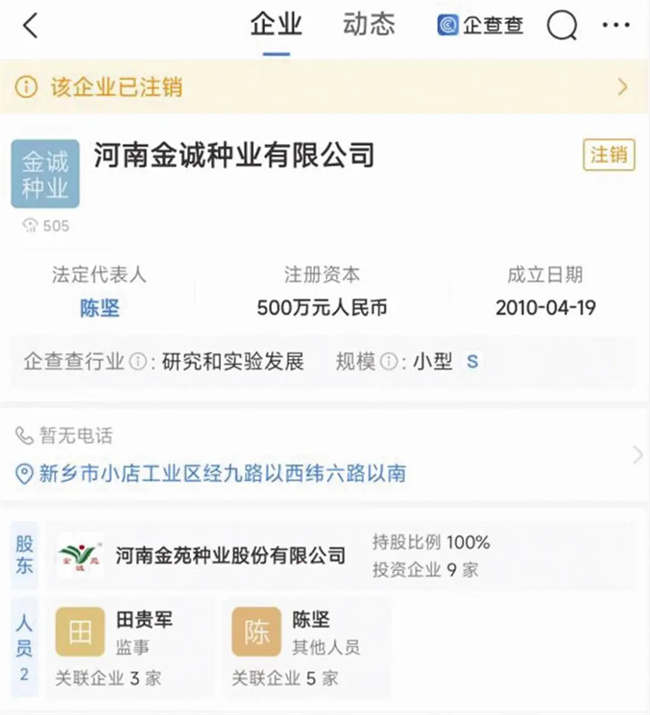 河南金誠種業(yè)有限公司(下稱“河南金誠”)曾是金苑種業(yè)全資子公司,工商信息顯示于2010年4月成立,2011年3月注銷。其注銷時,公司持股100%,法定代表人為陳堅,陳堅還登記為其他人員,監(jiān)事則是田貴軍。