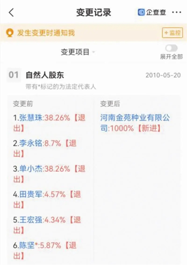 不過,通過企查查查詢的工商信息顯示,2010年5月20日,金苑種業(yè)才登記成為河南金誠的唯一股東,此前的6名自然人股東全部退出——他們是分別持股38.26%的張慧珠、單小杰,持股8.7%的李永銘,持股5.87%的陳堅,持股4.57%的田貴軍,持股4.34%的王宏強。