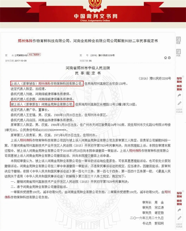 值得一提的是,鄭州偉科與公司之間還曾存在訴訟糾紛,而且為公司解散糾紛。中國裁判文書網(wǎng)顯示,金苑種業(yè)前身金苑有限曾因公司解散糾紛,起訴鄭州偉科,第三人為陳堅、田貴軍,鄭州偉科因不服一審判決提起上訴。