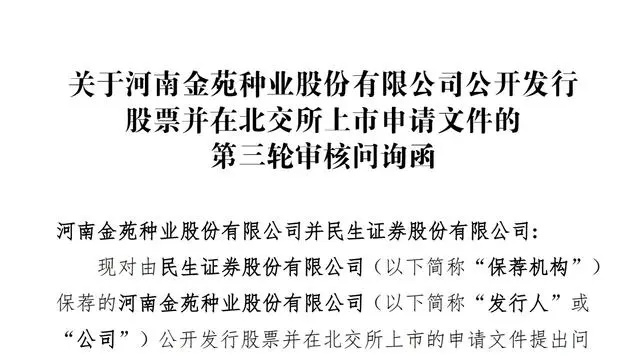 河南金苑種業(yè)股份有限公司(下稱“金苑種業(yè)”)正謀求登陸北交所,此前已收到第三輪問詢函。北交所關注到公司外購和授權經(jīng)營品種收入占比較高的風險,以及是否存在業(yè)績下滑的風險等,要求金苑種業(yè)就相關問題進行說明。截至8月9日18點,金苑種業(yè)尚未披露對第三輪問詢函的回復。
