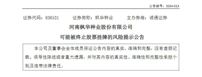 楓華種業(yè):公司股票存在被終止掛牌風(fēng)險(xiǎn)