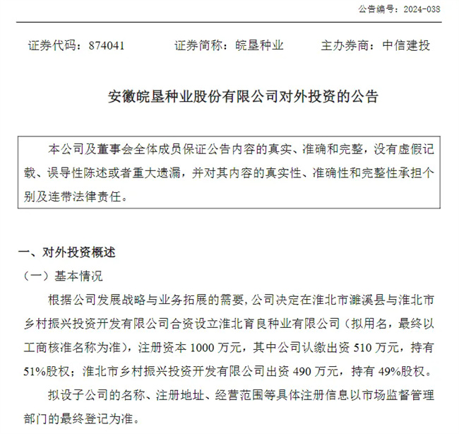 淮北育良種業(yè)有限公司注冊(cè)資本1000萬元,其中公司認(rèn)繳出資510萬元,持有51%股權(quán);淮北市鄉(xiāng)村振興投資開發(fā)有限公司出資490萬元,持有49%股權(quán)。2024年8月7日公司召開第五屆董事會(huì)第三次會(huì)議,審議通過了《關(guān)于組建淮北育良種業(yè)有限公司的議案》。