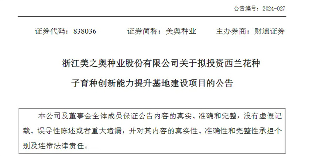 美奧種業(yè):擬投資建立西蘭花育種創(chuàng)新基地,總投資預(yù)計(jì)不超過3000萬;