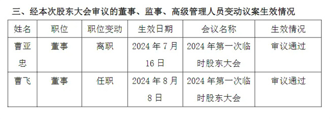 華豐種業(yè)發(fā)公告稱,公司第三屆董事會(huì)第九次會(huì)議于2024年8月8日審議并通過:任命曹飛為公司董事長,任職期限自2024年8月8日起至第三屆董事會(huì)屆滿之日止,自2024年8月8日起生效。