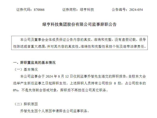 綠亨科技8月12日發(fā)布公告稱,監(jiān)事喬智先生遞交辭職報(bào)告。