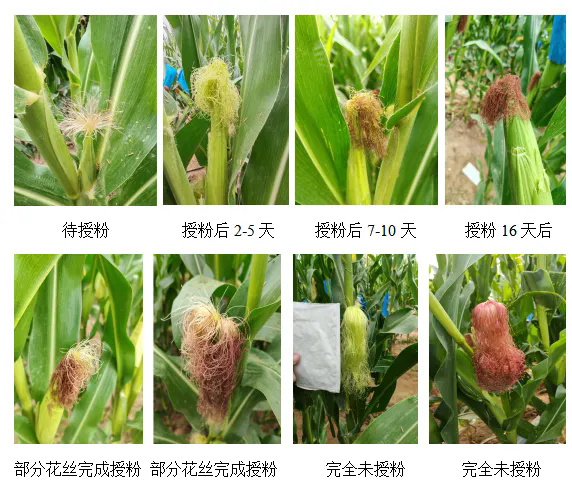 正常條件下,雄穗先抽雄、散粉,雌穗在幾天后,快速完成吐絲和接受花粉。授粉過后2-3天,花絲即與子房外壁分離。因此,當(dāng)掰開苞葉晃動果穗時,如花絲能大量掉落,說明授粉完成;如花絲仍緊附果穗,說明還未授粉或未能成功授粉。