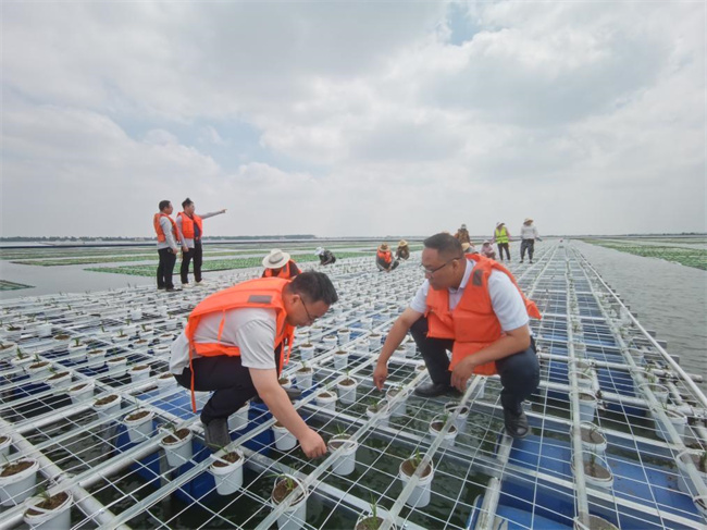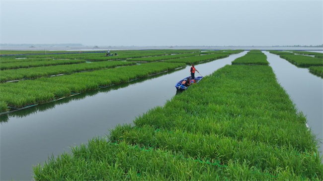 7月30日,項目工作人員在采煤地表沉陷區(qū)水面進行田間管理。新華社發(fā) 謝睿 攝