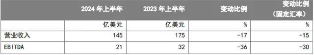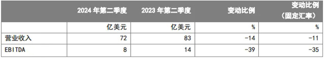 上半年 EBITDA 為 21 億美元,同比下降 36%(按固定匯率計算下降 30%)。2024 年上半年,集團(tuán) EBITDA 利潤率為 14.1%,與 2023 年上半年的 18.3% 相比,下降了 4.2 個百分點(diǎn)。2024 年第二季度營業(yè)收入為 72 億美元,比去年同期減少 11 億美元,同比下降 14%(按固定匯率計算下降 11%)。