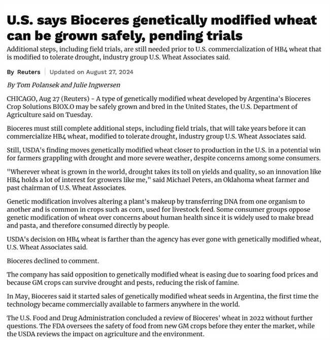 8 月 27 日美國(guó)農(nóng)業(yè)部宣布,根據(jù)對(duì)阿根廷 Bioceres 公司研發(fā)的轉(zhuǎn)基因耐旱小麥 HB4 的審查,該品種不太可能增加作物病蟲害,可在美國(guó)境內(nèi)安全種植。這標(biāo)志著轉(zhuǎn)基因小麥在美的推廣邁出重要一步。