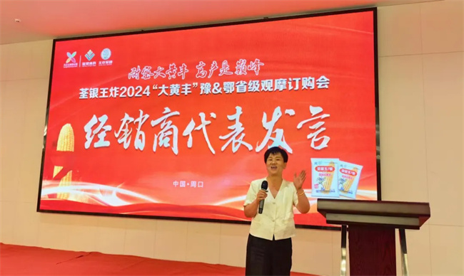 優(yōu)秀客戶代表周口盈碩農(nóng)業(yè)科技有限公司總經(jīng)理彭翠英,忍不住上臺分享“荃銀大黃豐”經(jīng)銷推廣經(jīng)驗。彭總表示,初期認為“荃銀大黃豐”只是普通品種,但隨著當?shù)亓闶凵滩粩嗌祥T補貨,引起了她的關注與重視;合作兩年間,彭總用鏡頭記錄了荃銀大黃豐在周口各地驚人表現(xiàn),她自信地說:經(jīng)過反復驗證,我可以底氣十足的向老百姓推薦“荃銀大黃豐”,這的的確確是個不多見的好品種!