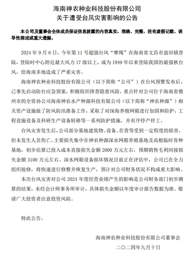 9月10日,海南神農(nóng)種業(yè)科技股份有限公司(下稱“神農(nóng)種業(yè)”)發(fā)布關(guān)于遭受臺(tái)風(fēng)災(zāi)害影響的公告。公告稱,臺(tái)風(fēng)災(zāi)害發(fā)生后,公司初步估算已投入成本直接損失金額2000萬(wàn)元左右,預(yù)期銷售毛利間接損失金額3100萬(wàn)元左右。