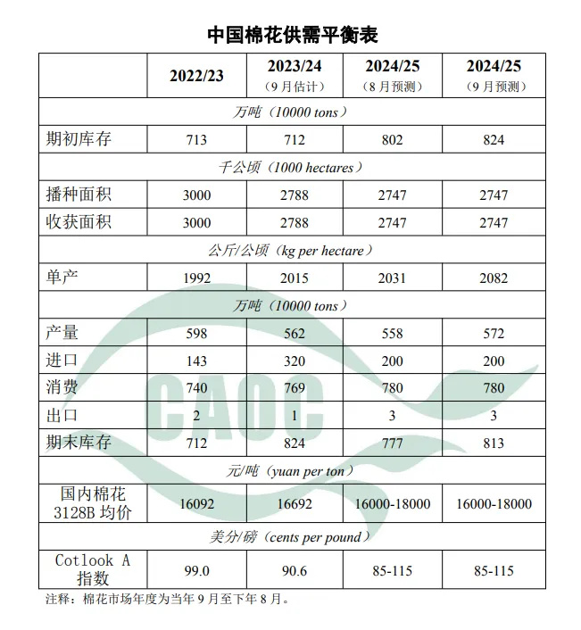 今年全國(guó)棉區(qū)綜合氣象條件適宜,病蟲害輕度發(fā)生,棉花長(zhǎng)勢(shì)總體好于上年,預(yù)期單產(chǎn)增加,本月將2024/25年度產(chǎn)量調(diào)增至572萬(wàn)噸,較上年度增1.8%。當(dāng)前部分地區(qū)新棉零星上市,開秤價(jià)低于去年,預(yù)計(jì)新疆集中上市時(shí)間提前至9月末,隨著棉紡市場(chǎng)傳統(tǒng)旺季臨近,棉花需求有望回升。