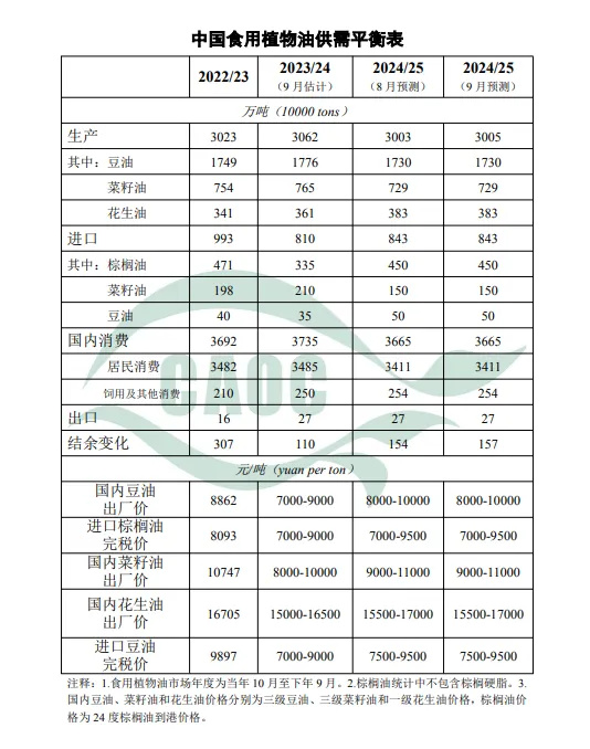 本月預(yù)測(cè),2024/25年度,受棉花產(chǎn)量增加影響,中國(guó)食用植物油產(chǎn)量調(diào)整至3005萬(wàn)噸,比上月預(yù)測(cè)值增加2萬(wàn)噸。近期新季花生陸續(xù)上市,主要產(chǎn)區(qū)氣象條件良好,利于收獲晾曬,本月暫不對(duì)花生產(chǎn)量進(jìn)行調(diào)整。