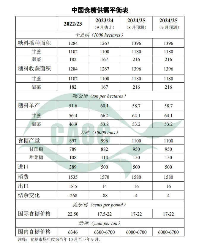 本月對(duì)中國(guó)食糖供需形勢(shì)預(yù)測(cè)數(shù)據(jù)不作調(diào)整。2023/24年度制糖期即將結(jié)束,截至8月底,全國(guó)累計(jì)銷糖886萬(wàn)噸,同比增長(zhǎng)9.6%;累計(jì)銷糖率88.9%,同比放緩1.2個(gè)百分點(diǎn)。廣西、廣東、海南等甘蔗主產(chǎn)區(qū)受臺(tái)風(fēng)“摩羯”影響,局地甘蔗倒伏、折斷;內(nèi)蒙古甜菜主產(chǎn)區(qū)近期降雨,不利于糖分積累,具體影響程度需跟蹤評(píng)估。新舊年度交替,陳糖持續(xù)去庫(kù)存,市場(chǎng)采購(gòu)以剛需為主,糖價(jià)弱勢(shì)震蕩。