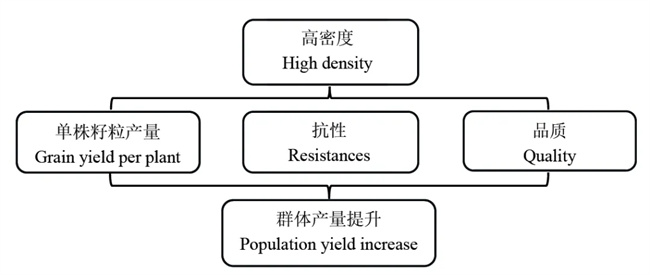單位面積的果穗數(shù)、穗粒數(shù)和百粒重是玉米產(chǎn)量的3個(gè)主要構(gòu)成因子,通過增加密度提高單位面積的果穗數(shù)量已經(jīng)成為玉米產(chǎn)量提升的一個(gè)重要育種目標(biāo)。前人研究結(jié)果表明,增加玉米密度將導(dǎo)致田間通風(fēng)透光不良,植株變高、莖稈變細(xì),結(jié)實(shí)性變差,抗倒伏、抗病性等綜合抗性減低,從而導(dǎo)致單株生產(chǎn)力降低,玉米果穗和籽粒易感染穗粒腐等病害造成商品品質(zhì)下降。因此,在育種過程中需要解決密植條件下玉米產(chǎn)量、抗性和品質(zhì)協(xié)同關(guān)系(圖1),通過多種育種策略實(shí)現(xiàn)玉米產(chǎn)量、抗性與品質(zhì)的同步提升。
