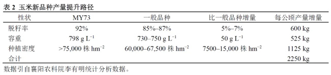 由于雜種優(yōu)勢(shì)是生物體多個(gè)性狀的綜合表現(xiàn),雜種優(yōu)勢(shì)降低會(huì)導(dǎo)致果穗變小,致使單穗籽粒重降低從而影響玉米產(chǎn)量。玉米單穗產(chǎn)量的主要構(gòu)成因子除穗行數(shù)、行粒數(shù)和百粒重外,容重和脫籽率也是影響單穗籽粒重的2個(gè)重要次級(jí)因子;容重高的品種多數(shù)為硬粒型,籽粒較短,脫籽率偏低,因此育種家一般認(rèn)為容重和脫籽率呈負(fù)相關(guān)。近期巫永睿團(tuán)隊(duì)克隆了籽粒硬度的基因Ven1(vitreous eddosperm1),該基因編碼β-胡蘿卜素羥化酶3,通過介導(dǎo)淀粉體膜的穩(wěn)定性調(diào)控蛋白體與淀粉體的互作影響籽粒硬度;玉米籽粒大小調(diào)控基因解析結(jié)果表明,脫籽率與籽粒的長度密切相關(guān),如ZmUrb2、Zmsmk4和ZmVKS1等基因。大量籽粒大小與品質(zhì)相關(guān)基因研究結(jié)果表明,籽粒容重和脫籽率由2個(gè)不同的生物學(xué)調(diào)控途徑,可以對(duì)調(diào)控容重和籽粒大小的關(guān)鍵基因進(jìn)行聚合,破解容重和脫籽率不能兼容的育種難題;通過增加容重和脫籽率進(jìn)而實(shí)現(xiàn)高密度條件下果穗變小,而單穗籽粒重不降低的育種目標(biāo),最終提高單位面積產(chǎn)量。以黃淮海目前生產(chǎn)上大面積推廣的玉米品種MY73為例,其容重為798g/L,脫籽率92%,適宜種植密度為82,500~90,000株hm²,通過3個(gè)產(chǎn)量因子的疊加提升可以使每公頃產(chǎn)量平均增加2250kg左右(表2)。