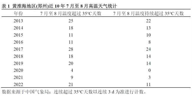 黃淮海區(qū)域?qū)儆谂瘻貛О霛駶櫄夂蝾愋?,玉米生長季節(jié)溫度高,降水過度集中,局部強(qiáng)對(duì)流天氣頻發(fā),旱災(zāi)、澇災(zāi)、陰雨寡照和風(fēng)災(zāi)等自然災(zāi)害時(shí)有發(fā)生,例如,2013年和2014年黃淮海局部地區(qū)的高溫干旱,2021年臺(tái)風(fēng)“煙花”帶來的暴雨,以及2022年大范圍的高溫等逆境氣候均給玉米生產(chǎn)造成了極大的影響。特別是近年來頻繁發(fā)生的異常高溫天氣常致使玉米雌穗發(fā)育異常、花藥外漏開裂困難、花粉活力下降,導(dǎo)致玉米大幅度減產(chǎn)。據(jù)推測(cè)世界平均氣溫每升高1℃,玉米的產(chǎn)量將降低7.4%左右,而近年來玉米生長季節(jié)極端高溫天氣已經(jīng)常態(tài)化,以河南省鄭州地區(qū)為例,2013—2022年10年間超過35℃的高溫天氣越來越多(表1),給玉米生產(chǎn)造成了嚴(yán)重的影響。