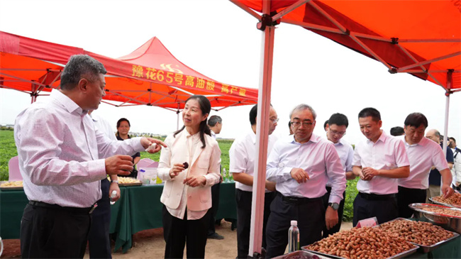 全國農業(yè)技術推廣服務中心黨委書記張曄在講話中指出,好品種是育出來的,好種子制出來的,大品種是比出來的。張曄強調,品種展示評價是甄別品種優(yōu)劣的“試金石”,一頭連著品種選育、一頭連著大地生產,一頭連著科研單位、一頭連著種子企業(yè),是融通創(chuàng)新攻關和企業(yè)扶優(yōu)的重要支點,是加快種業(yè)科技成果轉化的有效途徑,也是強化品種全生命周期管理、提升種業(yè)現代化治理水平的重要抓手。張曄指出,玉米是我國種植面積最大的糧食作物,花生是產油效率最高的油料作物。今年的活動首次實現玉米、花生同臺大匯演、大比武,以糧油并舉推動糧食安全更加穩(wěn)固,這是貫徹穩(wěn)糧擴油戰(zhàn)略、因地制宜發(fā)展新質生產力的具體行動。這次活動展出的河南秋樂、山東登海、北京農林科學院、河南省農科院等頭部企業(yè)和優(yōu)勢科研單位選育的38個玉米、40個高油酸花生優(yōu)良新品種,代表了黃淮海地區(qū)育種創(chuàng)新的最高水平。將為大面積單產提升注入強勁的良種動力。張曄強調,廣大種業(yè)工作者要牢記習近平總書記的殷殷囑托,按照中央種業(yè)振興行動的戰(zhàn)略部署,團結一心、攜手奮進,以更大的歷史主動,更強的使命擔當,為品種創(chuàng)新、企業(yè)壯大、大面積單產提升作出更大貢獻,以優(yōu)異成績向建國75周年獻禮!