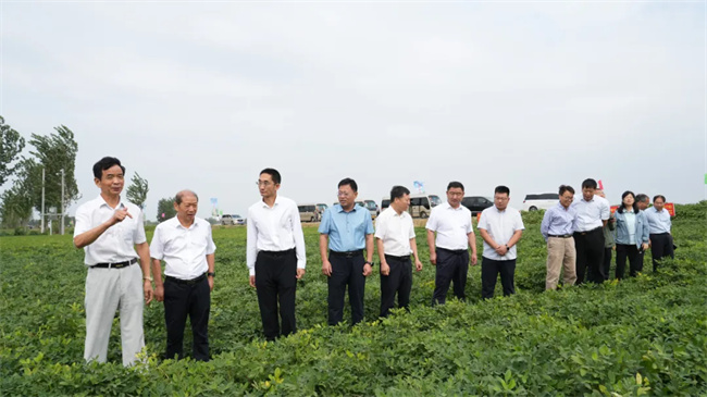 會(huì)前,參會(huì)嘉賓觀摩了河南省花生良種聯(lián)合攻關(guān)項(xiàng)目尉氏縣萬畝示范方,對優(yōu)質(zhì)、高產(chǎn)、抗病、宜機(jī)收花生新品種農(nóng)大花108、農(nóng)大花206、農(nóng)大花201、豫科花1號、沃花2號、沃花6號以及其他新品種田間長勢、飽果率、抗病等情況,進(jìn)行詳細(xì)觀察研判,聽取了金沃野農(nóng)業(yè)董事長李憲挺對萬畝示范方建設(shè)情況匯報(bào)。