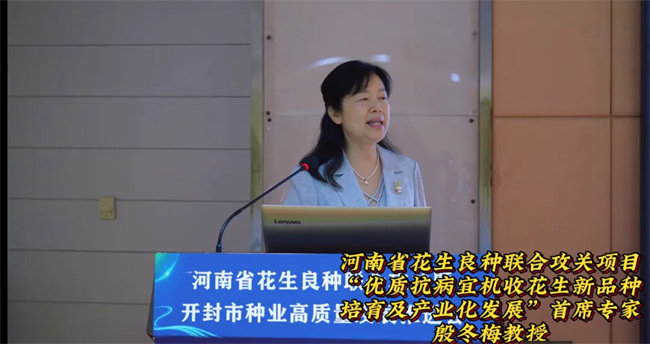 河南省花生良種聯(lián)合攻關(guān)項(xiàng)目“優(yōu)質(zhì)抗病宜機(jī)收花生新品種培育及產(chǎn)業(yè)化發(fā)展”首席專家、河南農(nóng)業(yè)大學(xué)教授殷冬梅做項(xiàng)目實(shí)施情況匯報(bào)。殷冬梅表示,堅(jiān)持培育出抗性好、產(chǎn)量高,挖掘優(yōu)異種質(zhì)資源和新品種創(chuàng)制,通過項(xiàng)目實(shí)施,選育抗性更強(qiáng)、品質(zhì)更優(yōu)、產(chǎn)量更高的突破性品種是良種聯(lián)合攻關(guān)的主要目標(biāo)。