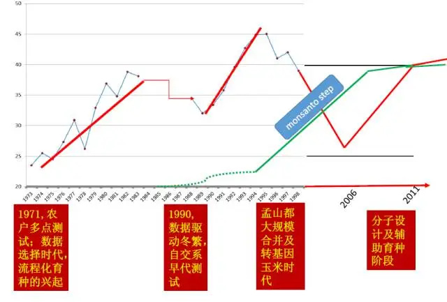 當(dāng)今社會發(fā)展飛速,各行各業(yè)都發(fā)生了翻天覆地的變化。唯獨農(nóng)業(yè)發(fā)展落后,尤其種業(yè)。我們以下圖簡單的回顧一下美國兩大巨頭種子公司的對比,來說明技術(shù)帶來的巨大變化(顛覆式創(chuàng)新)。我很早讀過《三體》,延伸出“升維思考、降維打擊”的思考,只在一個點上思考往往是無效的,這才是顛覆式創(chuàng)新的核心思想,你有沒有那樣的思想和格局,有沒有大的格局下重構(gòu)思想模式,然后再找到一個基本點去切入。下圖中我們可以看出四次(創(chuàng)新)大的變化帶來公司業(yè)績的大幅上升。第一次,1971年,當(dāng)別的公司還在一個區(qū)域或少數(shù)幾個點時,先鋒采用多點測試使得品種推廣時更加精確;第二次,冬繁和早代測試再次使得先鋒超越其它公司;第三次,這次孟山都擺脫傳統(tǒng)做法,實現(xiàn)顛覆式創(chuàng)新,利用轉(zhuǎn)基因技術(shù)迅速超越先鋒(因為打法完全發(fā)生了變化。);第四次,分子設(shè)計育種使得先鋒再次反超。