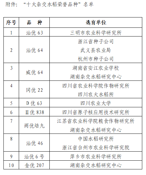 附件:“十大雜交水稻榮譽(yù)品種”名單