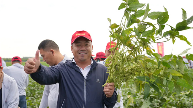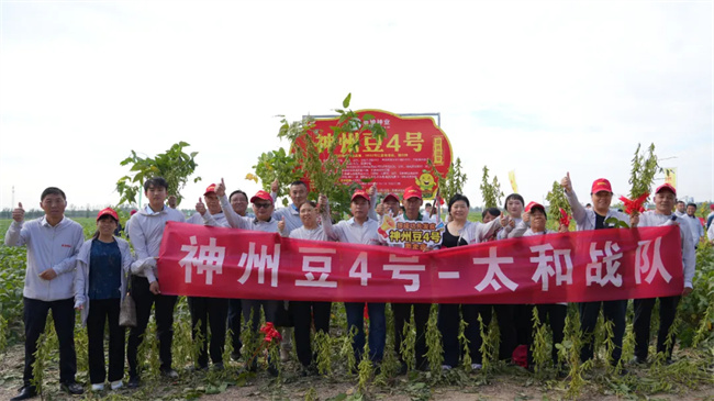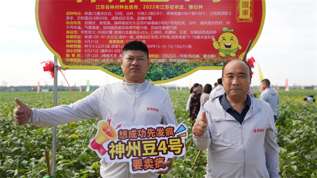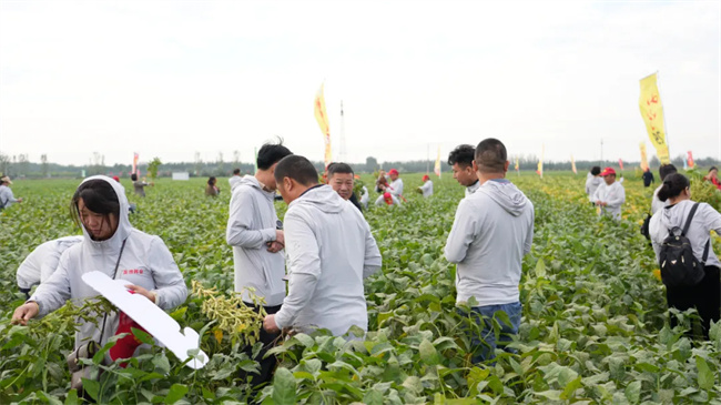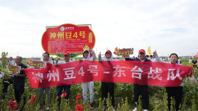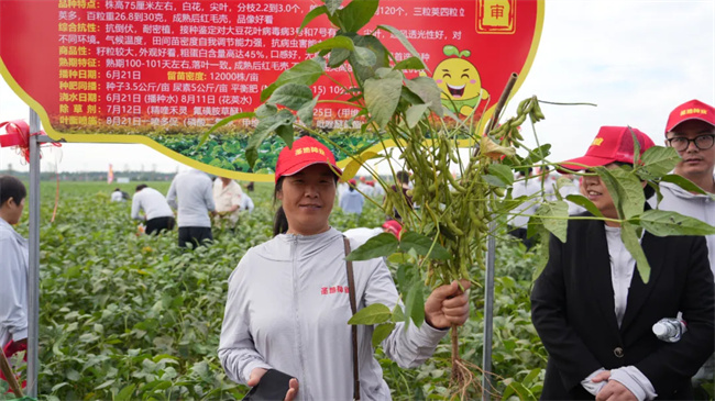 田間觀摩品種豐富,共慶豐收喜悅。名門之后,匠心之作——山寧29,高蛋白(46.4%)、大籽粒、商品性好、抗癥青、高產(chǎn)耐密還抗倒;想成功,先發(fā)瘋——神州豆4號(hào)要賣瘋,抗性強(qiáng)、抗倒好、結(jié)莢多、落黃好,不裂莢;蓋鈞鎰院士團(tuán)隊(duì)選育——南農(nóng)66,產(chǎn)量高、適應(yīng)性廣、抗病強(qiáng)、結(jié)莢密、易機(jī)收;圣地1號(hào),紅毛大豆,大粒、高產(chǎn)、穩(wěn)產(chǎn)、結(jié)莢多、抗性好;蓋鈞鎰院士團(tuán)隊(duì)出品——南農(nóng)47,高蛋白(45%)、高產(chǎn)穩(wěn)產(chǎn)、分支多、結(jié)莢密、適應(yīng)性廣、易機(jī)收;跟著圣地種業(yè)走,幸福日子長(zhǎng)長(zhǎng)久久!